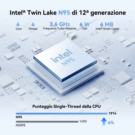 - Processore Intel® Celeron® N5095 | Grafica Intel® UHD 605 – Prestazioni fluide per le attività quotidiane con un consumo efficiente di soli 15W, supporta fino a due display 4K.